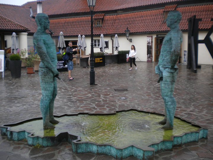 Това е в Прага, много близо до Карловия мост, това е музея на Франц Кафка, а пред музея е тази склуптура. Основата е карта на Чехия. Авторът е същия, изобрази България като тоалетна чиния, не е пропуснал и родината си. Живее много близо до музея на Кафка и ходи до една и съща бирария години подрес със старо ръждясало колело