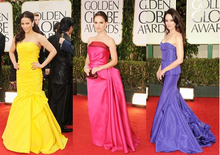 Екстравагантни цветовр - наситеножълто, виолетово, сребристо също имаше . Натали Портман (награда Златен Глобус Най-добра втростепенна женска роля 2005 Отблизо (Closer) и Най-добра главна женска роля: Черният лебед (2011) беше в яркорозова рокля на Lanvin