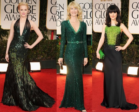 Изумруденозеленото е цвят, който също бе избран.Блистали актрисы и в нарядах глубокого изумрудного оттенка. Лаура Дерн в рокла с паети наAndrew Gn, Ейван Рейчел Вуд в разкошна рокля, която напомня опашка на паун на Gucci Premiere. Мадона порази присъстващите в сребристоизумрудена рокля на Reem Acra.