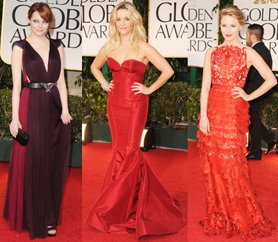 На червения цвят отдават своето предпочитание Reese Witherspoon, която в рокля на Zac Posen, Dianna Agron е в разкошна дантелена рокля на Giles. Други избират по-сдържан оттенък на червено - цвят на бургундско вино - Ема Стоун е в рокля плисе на Lanvin, а Джулианна Маргулис (награда Златен Глобус 2010 за най-добра главна женска роля в драма сериал) отдава предпочитанието си на рокля на Naeem Khan.