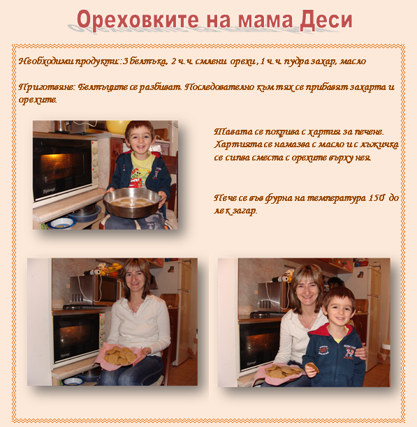 Приготвяне: Белтъците се разбиват. Последователно към тях се прибавят захарта и орехите.