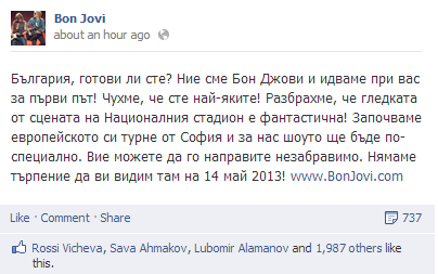 ФБ стр има над 18 милиона фена, но публикацията е на Бг за концерта в София