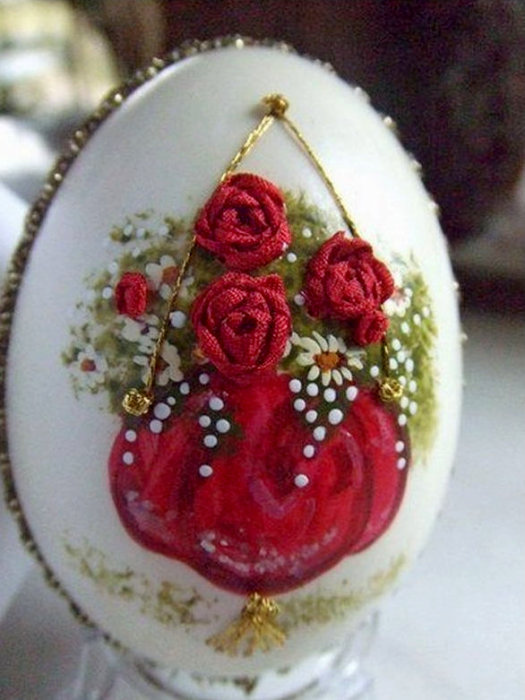С това трудоемко, но увлекателно творчество художничката се занимава повече от 10 години. С тънки разноцветни ленти тя рисува върху повърхността на яйцето цветя, дървета, птици, пеперуди, цели композиции като поздравителни картички за 8-ми март, Великден, Коледа, Нова година.
