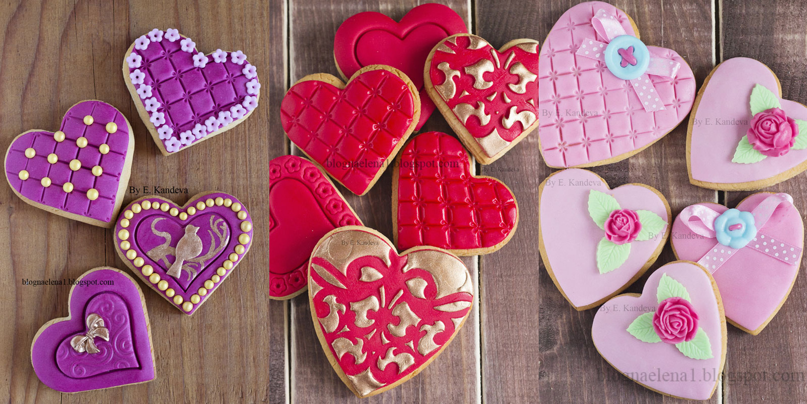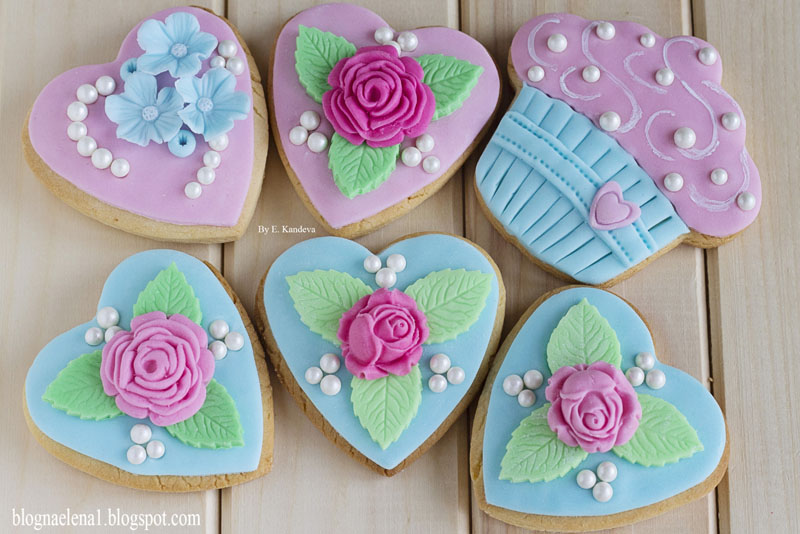 - маслени бисквити с форма на сърца с няколко вида украса