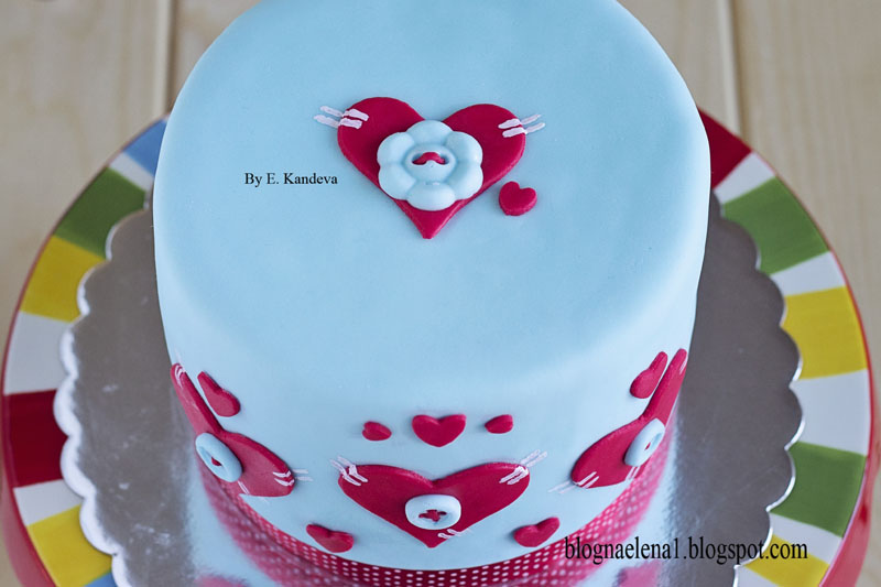 Тортата със сърцата направих за съпруга ми по случай празника на влюбените. Тя е съвсем малка, но украсена с идея. Всъщност, сърцата са закърпени и зашити с копчета от фондан, за да внушат идеята: „Да закърпим любовта!“ Блата е пандишпанов, а крема сметана и маскарпоне, но в случая наблегнах на визията, защото съпругът ми отдавна вече не се изненадва на вкуса на тортите ми, защото го познава. Новото за него беше украсата на малката тортичка. Изненадах го приятно.