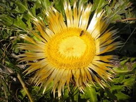 на снимката:Родопско слънчице - Расте по високото в Родопа планина. Прилича на слънчоглед, но е ниско долу до земята. Може да се яде, обелва се, има вкус на ряпа